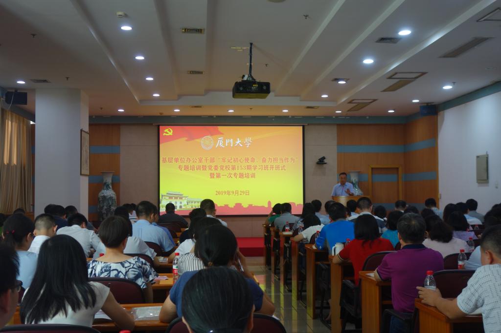 9月29日下午,厦门大学基层单位办公室干部“牢记初心使命、奋力担当作为”专题培训暨党委党校第153期学习班开班式暨第一次专题培训在颂恩楼220报告厅举行,各基层单位办公室干部和校办全体人员100余人参加了开班仪式和培训。