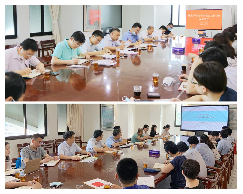 为巩固拓展“深化大学习、提振精气神”专项活动成果,更好地建设学习型党支部,学校办公室党支部决定依托办公室周例会、“固定党日+”和“三会一课”,建立定期集中学习制度,办公室全体在职党员在自学的基础上,结合自身工作实际,交流学习心得体会。6月1日和6月15日,办公室党员周民钦、李晴芳同志分别以“漫谈学校办公室工作中的保密管理”、“《民法典》解读——以高校法律应用情境为视角”为题,与大家分享了学习交流成果。接下来,学校办公室党支部还将结合督促检查等各项专门工作,继续开展学习交流活动。