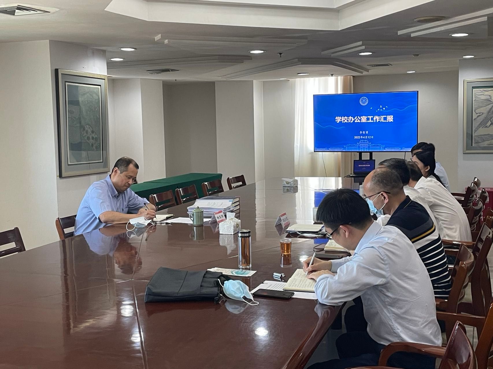 李智勇汇报了学校办公室近年来工作开展情况。近年来,在学校党委的正确领导下,学校办公室牢记习近平总书记在中央办公厅调研考察时提出的“五个坚持”的要求,树立一流意识、坚持一流标准,着力发挥好学校领导的参谋助手、学校运转的信息中枢、日常管理的综合协调、重要工作的督促落实等作用,努力在学校新百年新征程展现新气象新作为。