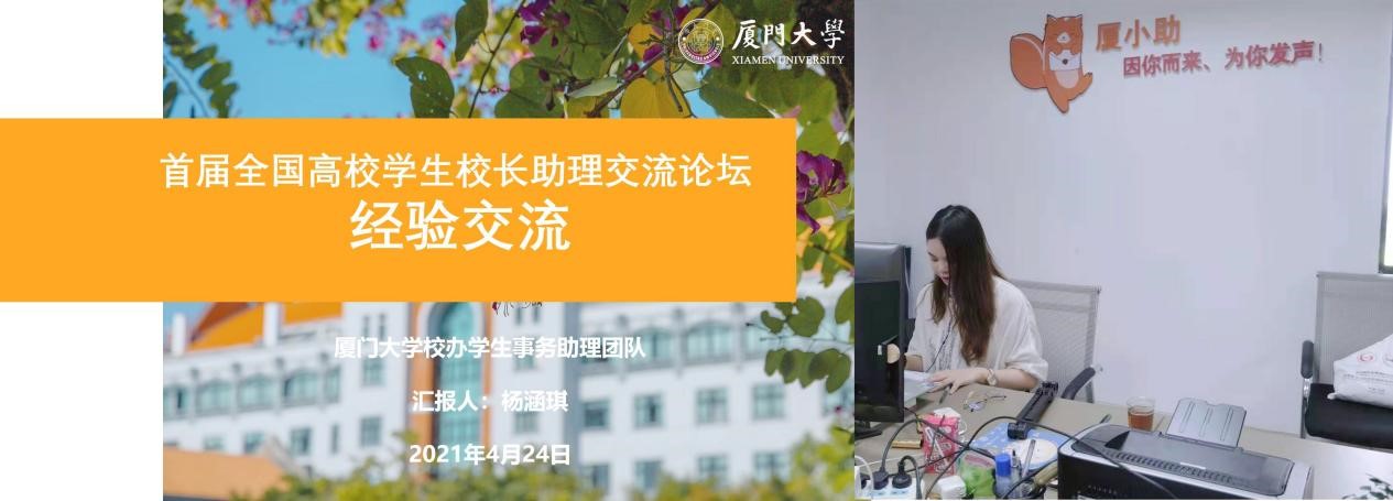 4月24日,首届全国高校学生校长助理交流论坛(线上)顺利召开。本届论坛以“沟通·交流·成长”为主题,来自安徽大学、厦门大学、华东师范大学等30个高校的校助团队相约云端,分享工作经历经验,共同交流心得体会。厦门大学校办学生事务助理团队(以下简称“厦小助”)受邀参加本次论坛,并作为代表进行开场致辞和经验交流汇报。